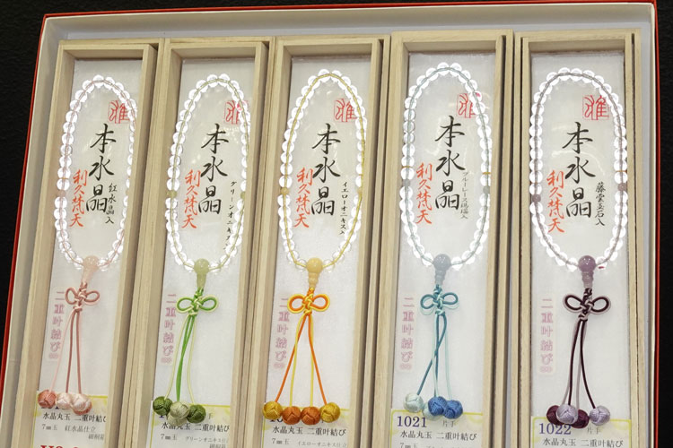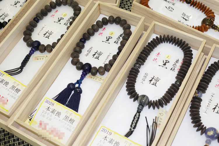 水晶・貴石・銘木の片手念珠(男性用・女性用)、腕輪念珠、抗菌を施した念珠などを展示します。