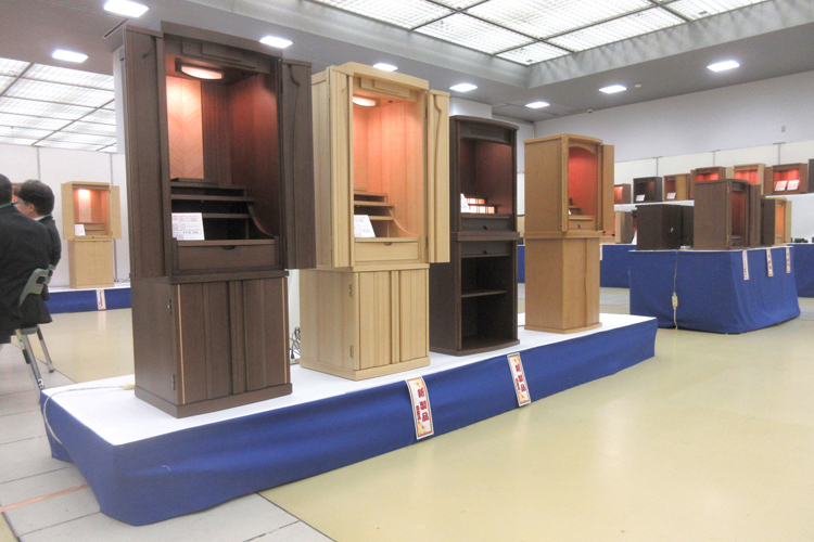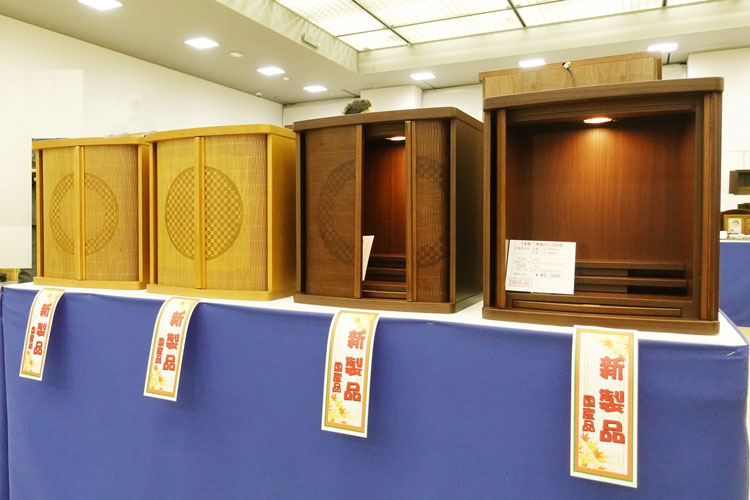 都市型仏壇(台付・別台。上置)各種多数出展。