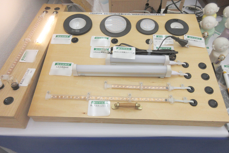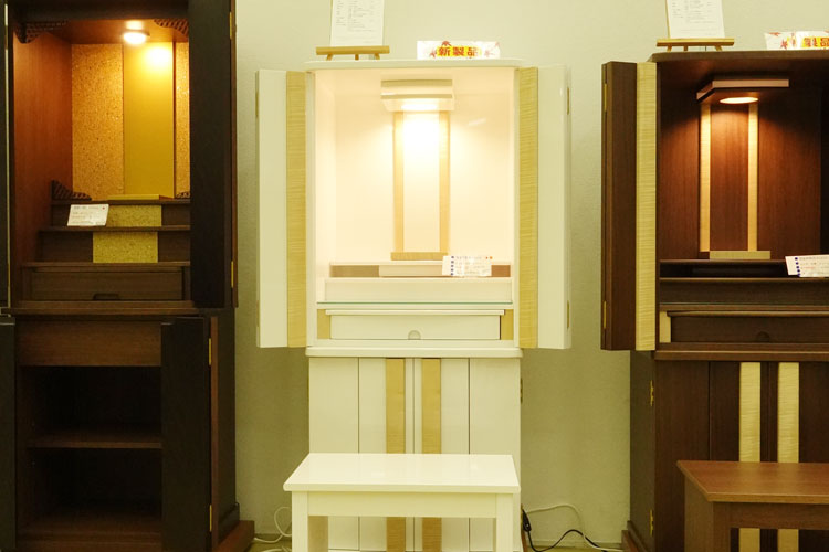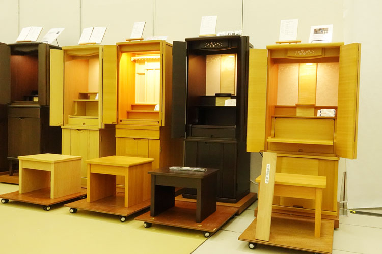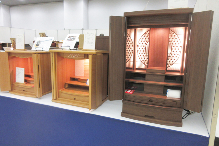都市型仏壇(上置・台付)新作多数。 仏具、LEDライトの展示も好評。