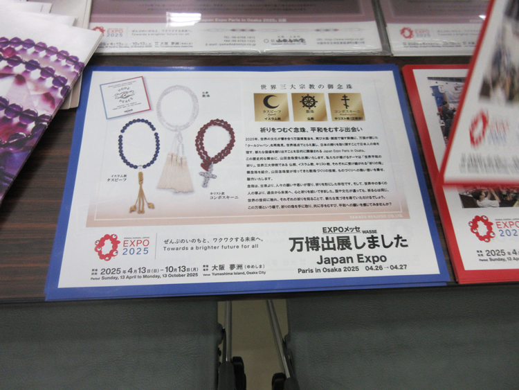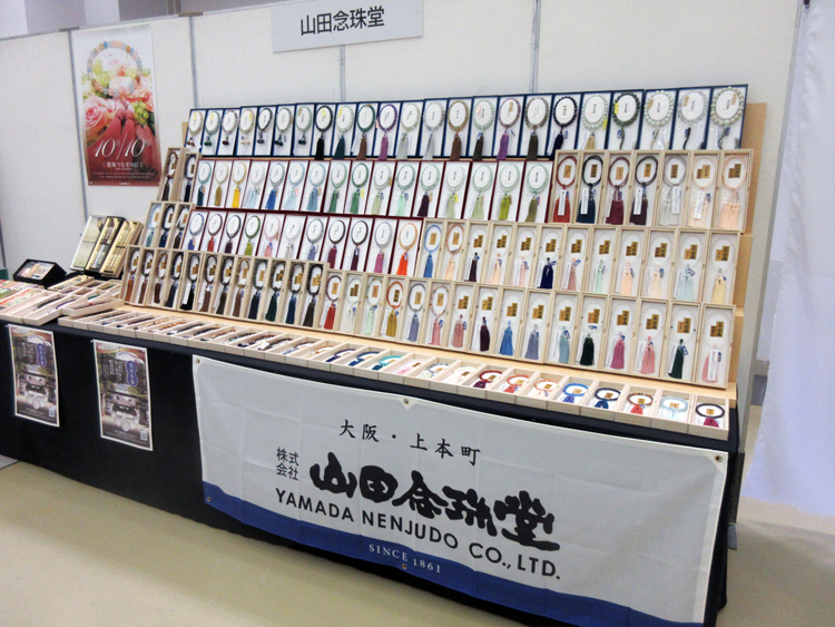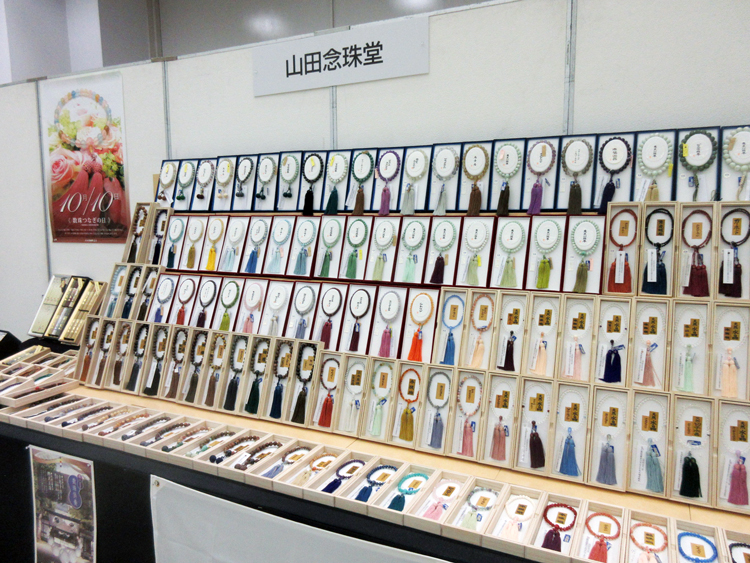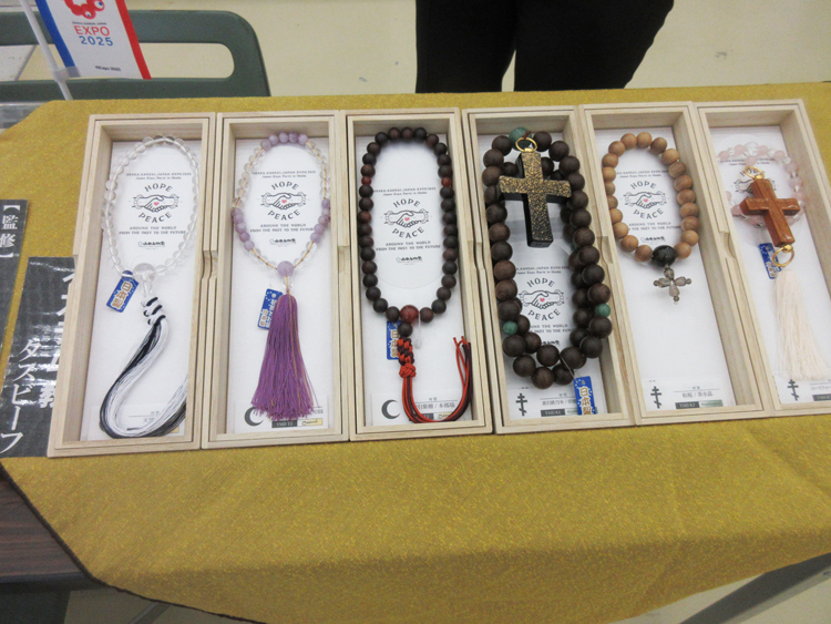 念珠各種(貴石・銘木・水晶・宗派別・女性用・男性用)を多数展示。キリスト教などの珠数も展示され好評。