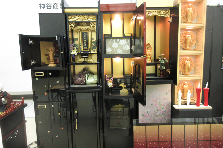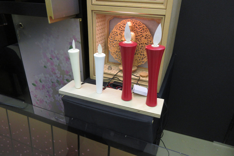 納骨壇、リモコン式僧侶、電気ローソクなどを展示。