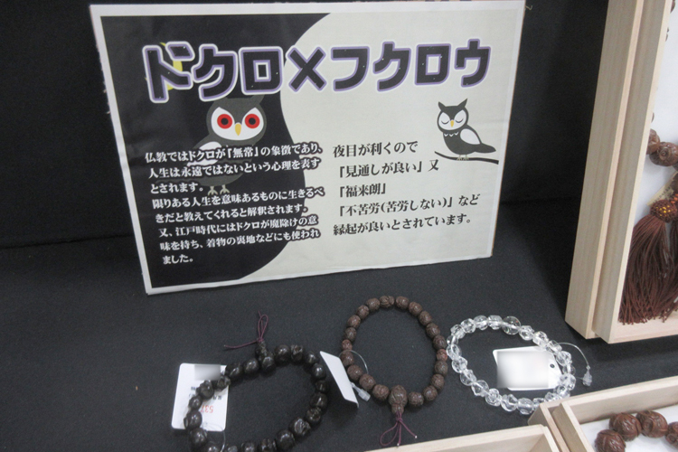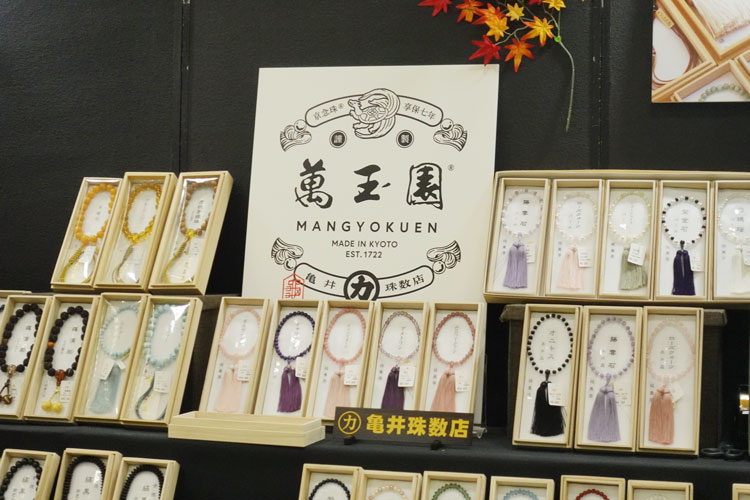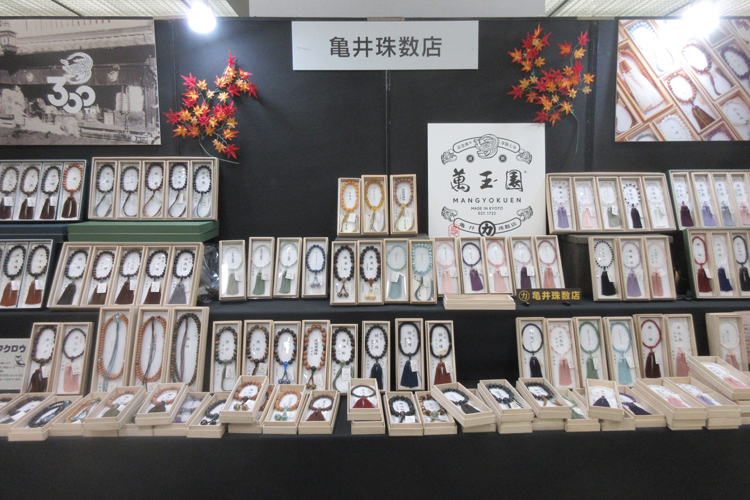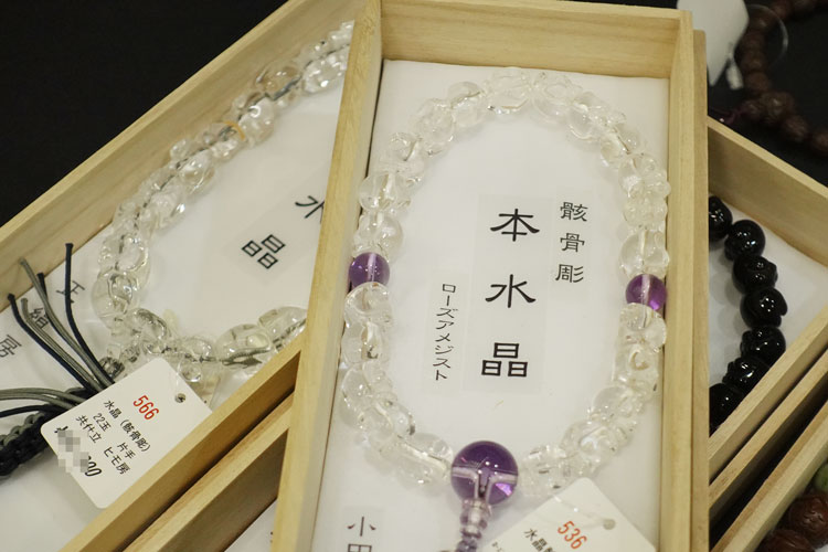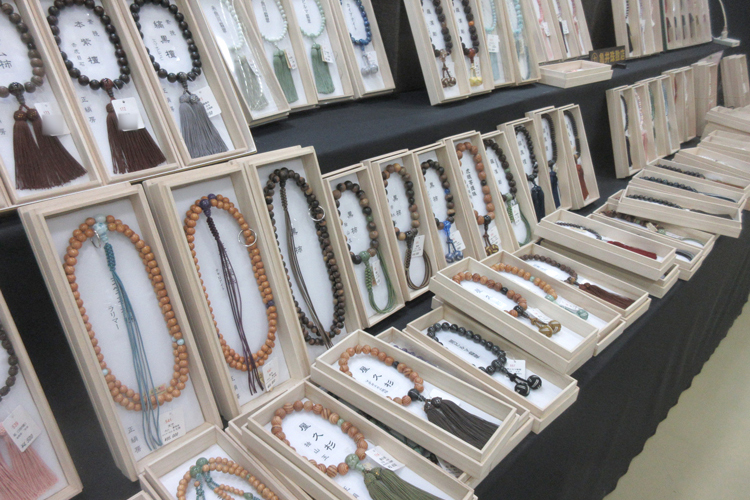 貴石、水晶、銘木、各宗派の珠数、黒柿念珠、古材加工念珠、貝パールの念珠などを展示。