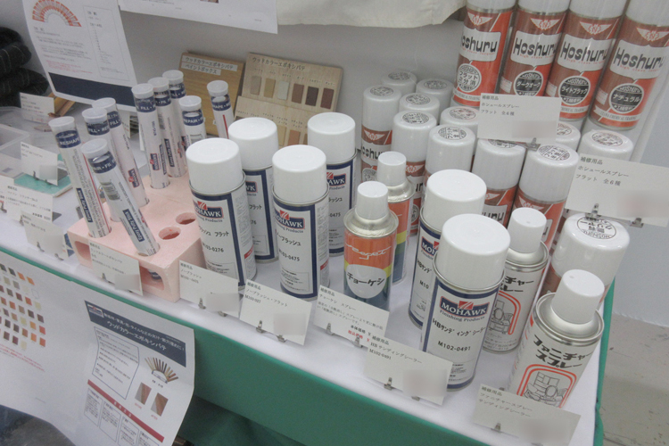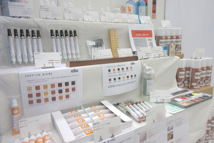 仏壇の運搬用具、包装資材、補修用品、補修剤などを多数展示。