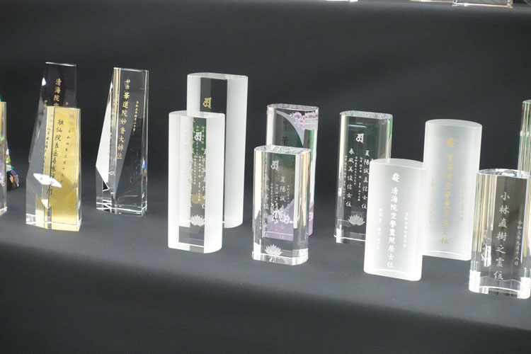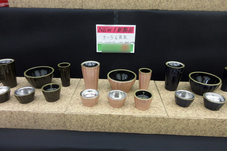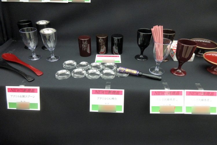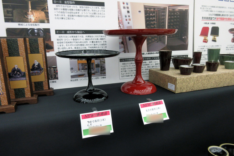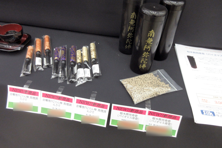 シルク仏具(樹脂製)、都市型仏壇、都市型仏具などを展示。筒型線香差、ステンレス灰落とし、楓りん棒などを展示。