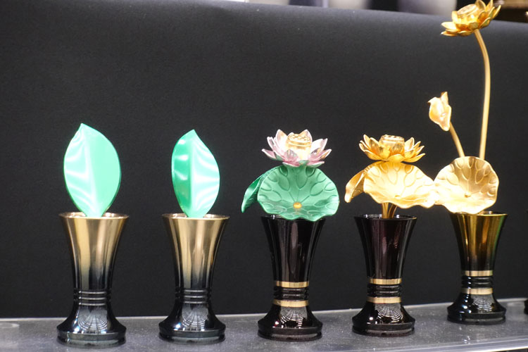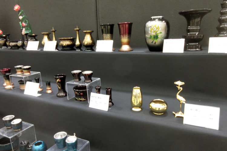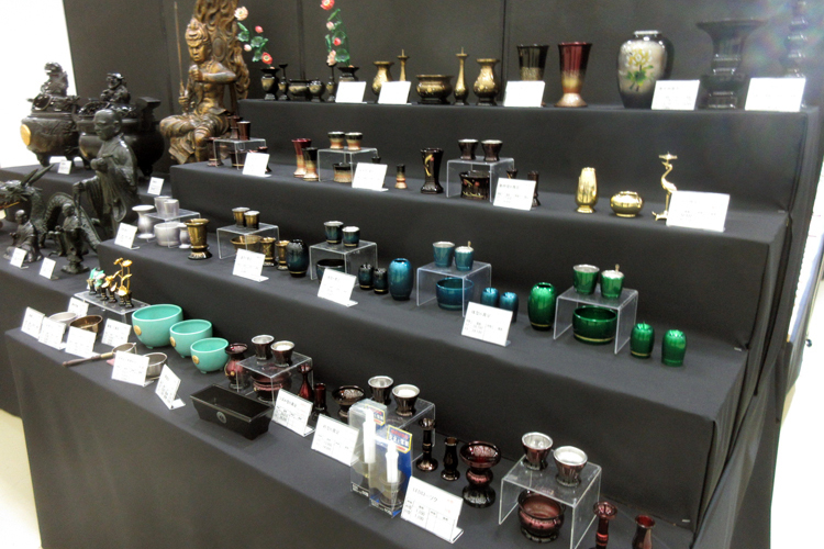銅器仏具(具足)を各種展示。カラー、デザインも豊富に取り揃え、都市型タイプから伝統型まで幅広く展示。