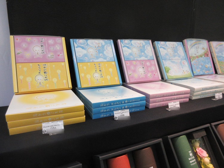 ボトルフラワー付きの香茶葉、プリザーブドフラワーとのアソートギフトをはじめ、有りが灯シリーズ、おはなしシリーズ、虹の橋シリーズ、TEATIMEシリーズ、パロサントノオトなどを展示。新作はホワイトセージノオト。