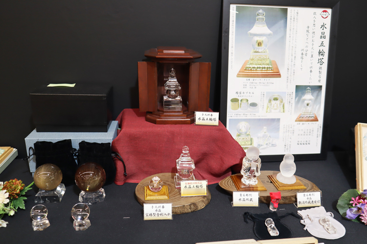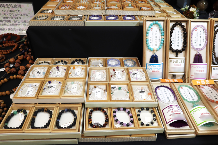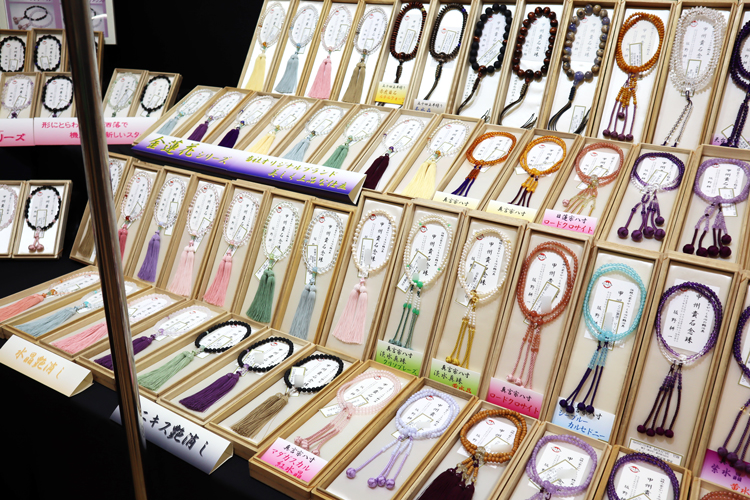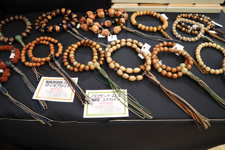 念珠、腕輪念珠、水晶製品など。金蓮花シリーズ、彫金念珠などを展示します。