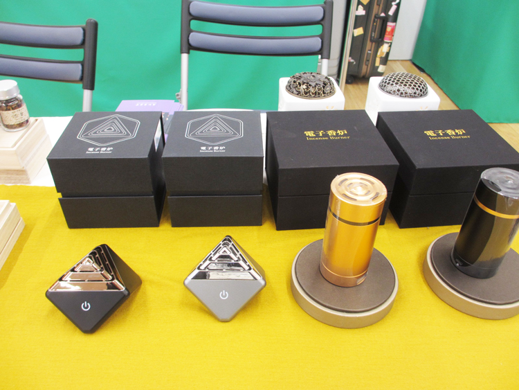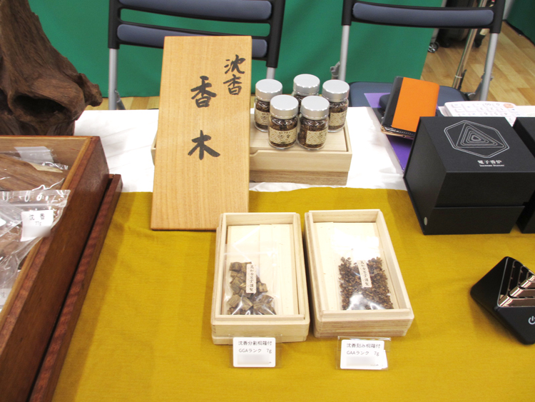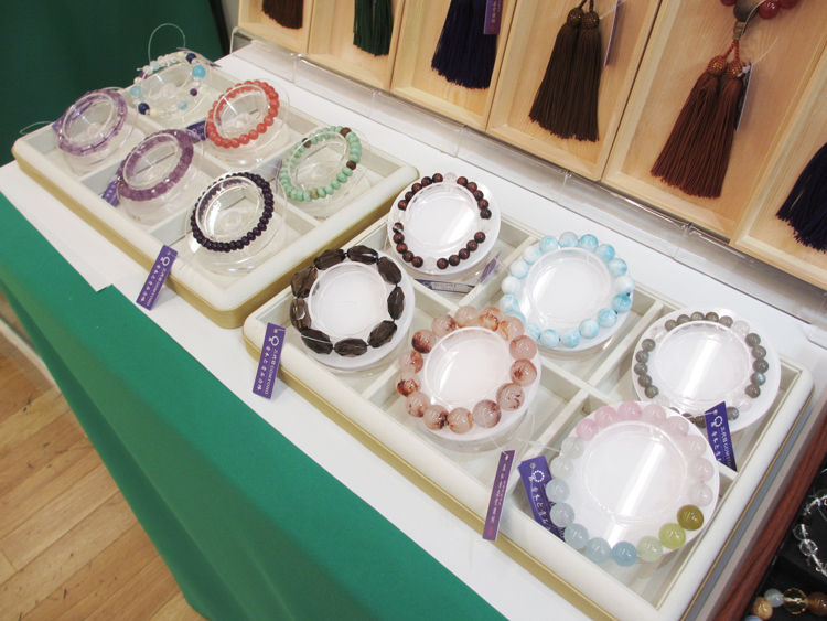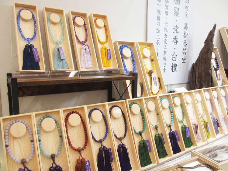 貴石、水晶、銘木の念珠、香木(伽羅・沈香・白檀)各種を豊富に展示。電子香炉も好評。