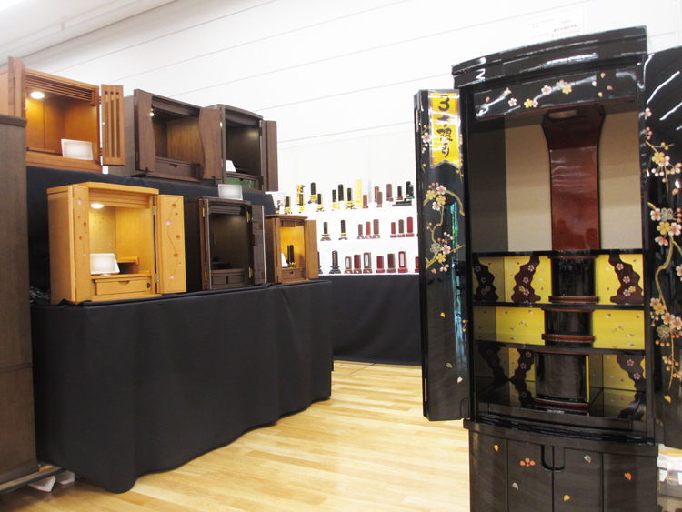 創作仏壇、金仏壇、唐木仏壇、都市型仏壇、仏具などを展示。位牌、スタンド掛軸も豊富に展示。