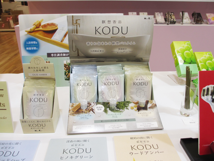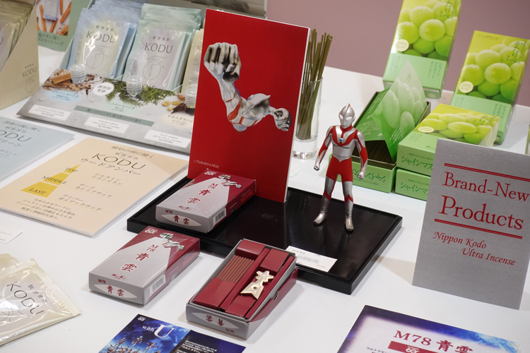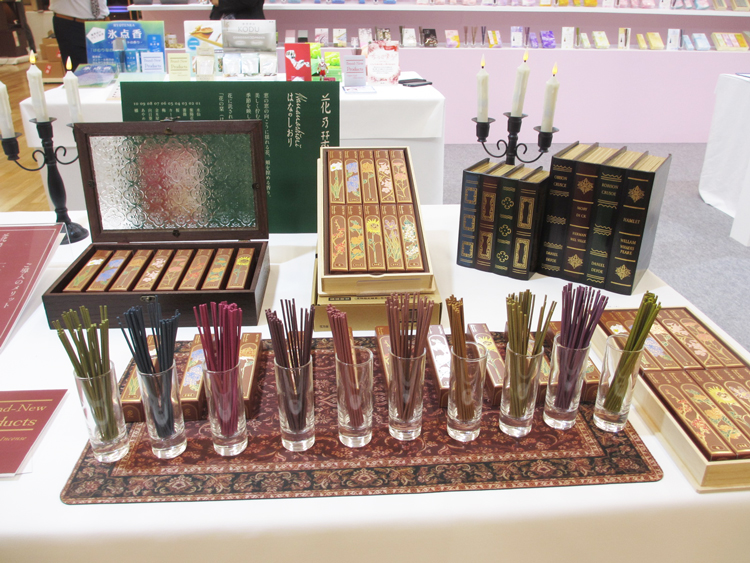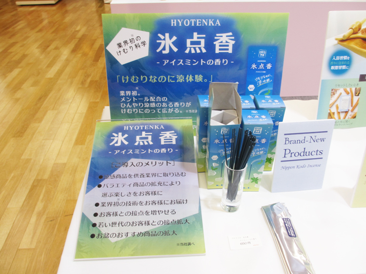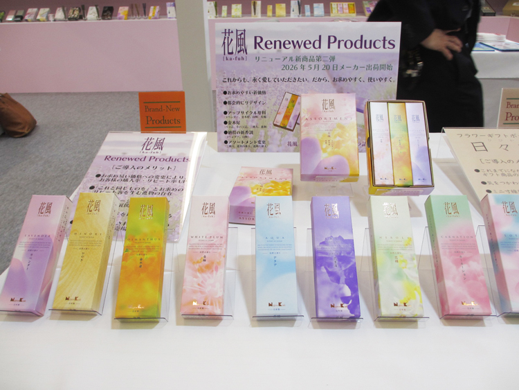ギフト線香(日々香フラワーギフト・花乃栞桐箱十種入)、家庭用線香(花風三種入・花風小バラ詰シリーズ)など新作多数。