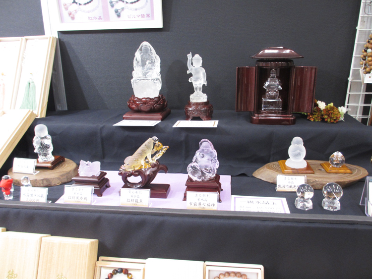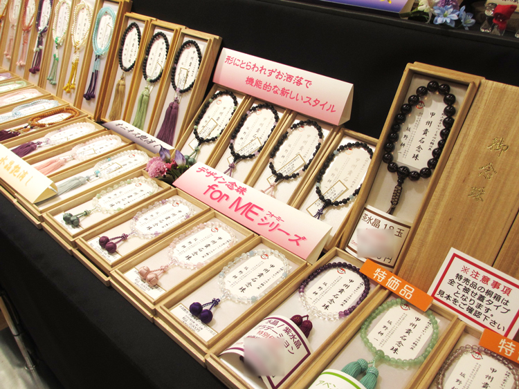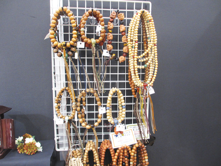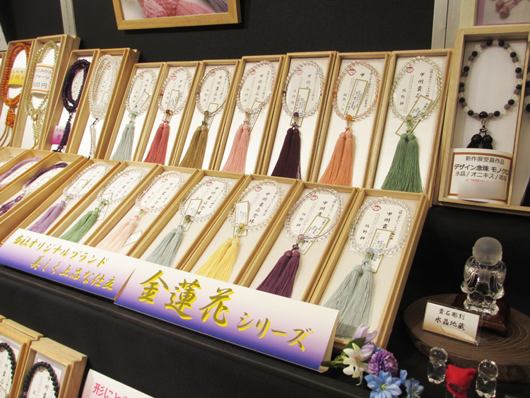 念珠、腕輪念珠、水晶製品など。金蓮花シリーズ、彫金念珠などを展示。