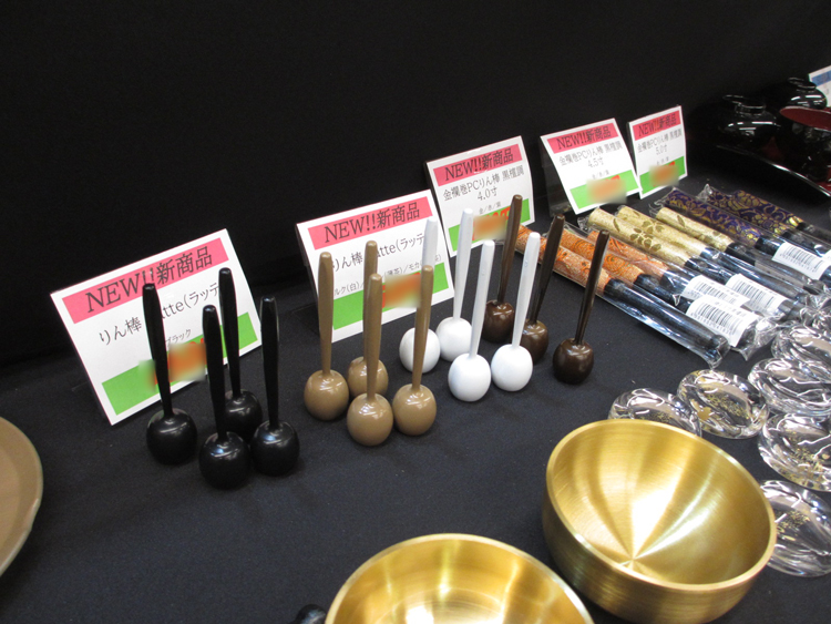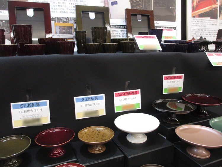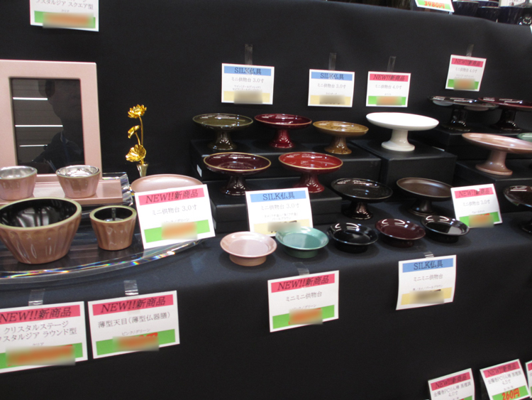 都市型仏壇、都市型仏具、クリスタル仏具などを多数展示。蓮華燭台モネ、このみリン台など新作多数。シルク仏具の新作はミニ供物台が好評。