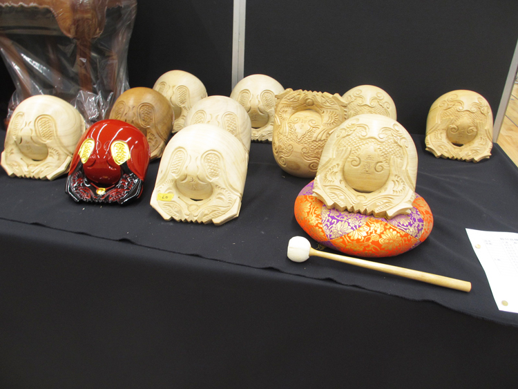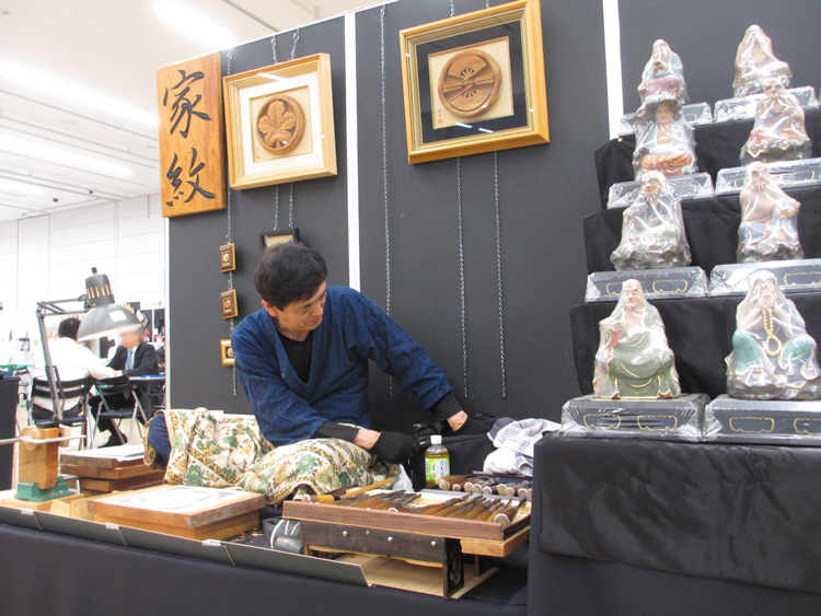 欅製家紋製作を職人が実演。在家用仏像・仏具、寺院用仏像・仏具などを出展。
